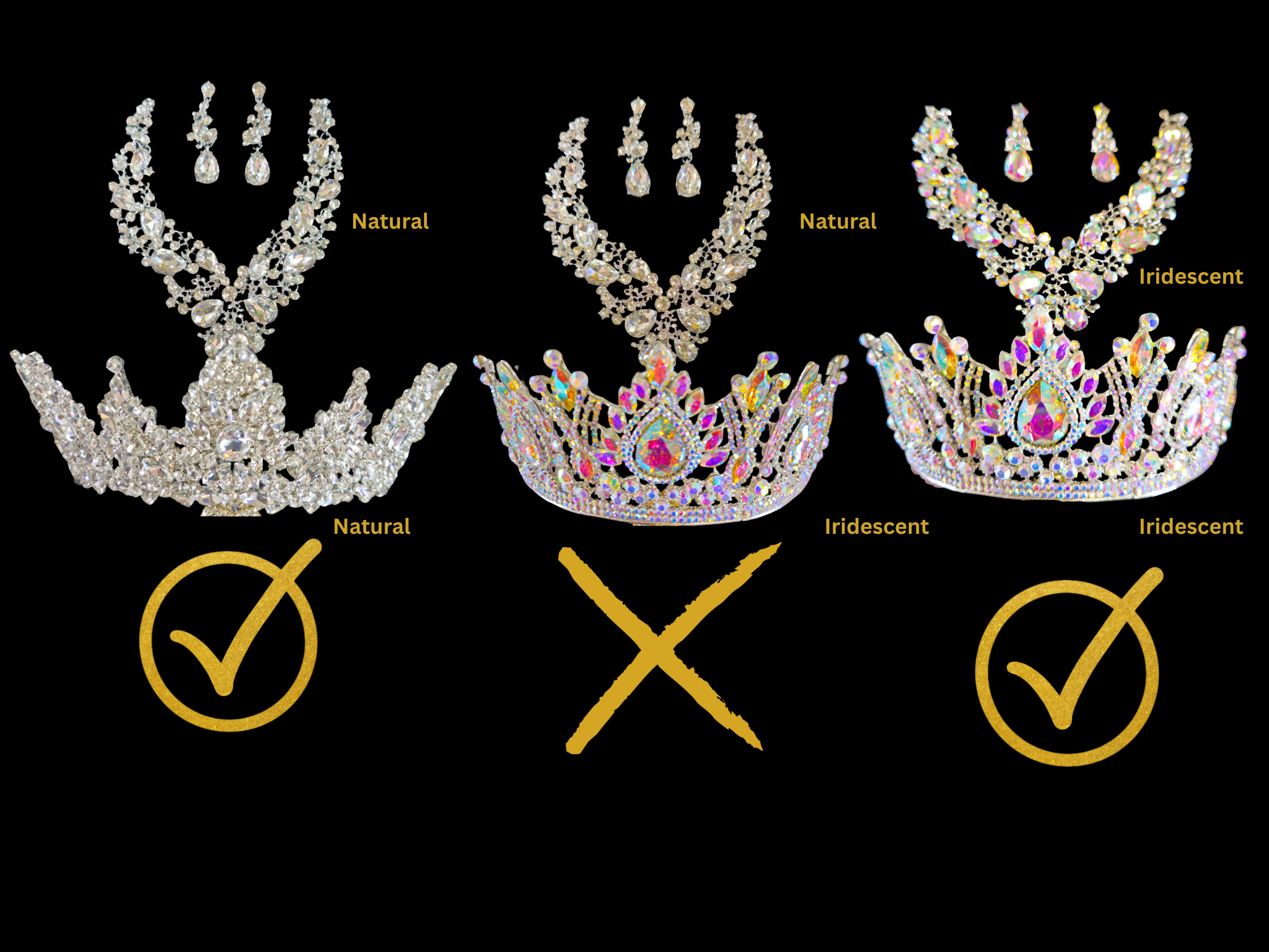 When it comes to stones, consistency is key. If the crown features iridescent stones, the necklace should mirror that same finish. If the crown has clear stones, the necklace should match. This coordination ensures that the accessories look intentional and polished in every photo.